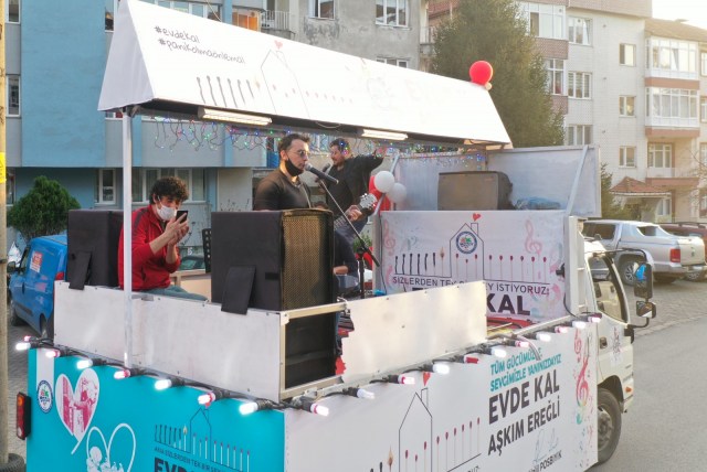 “Evde Kal Aşkım Ereğli” sloganıyla donatılmış, üstü açık müzik aracı, Cuma gününden itibaren Korubaşı Toki, Uzunmehmet, Kestaneci, Çevdarlı, Süleymanlar, Orhanlar, Yeşiltepe-Kepez’in bir bölümü, Bağlık Mahallesi’nin bir bölümü ile ana güzergahlarda ailelere, çocuklara moral oldu.