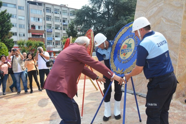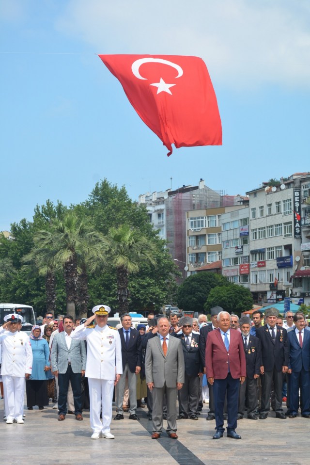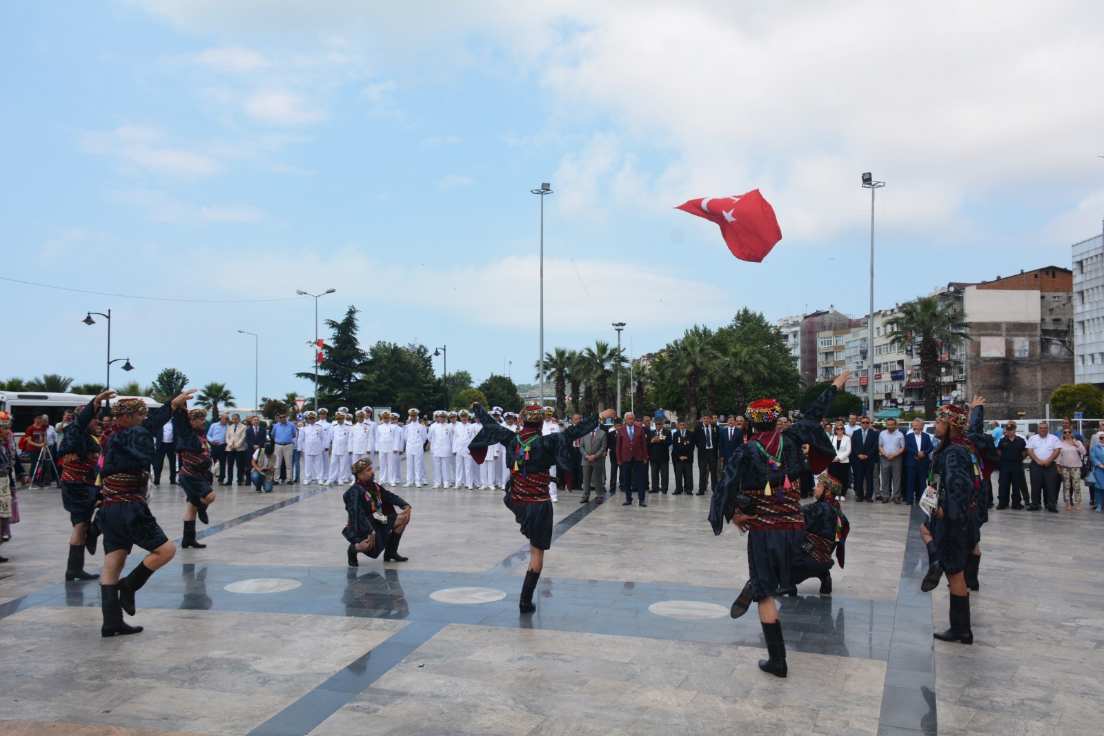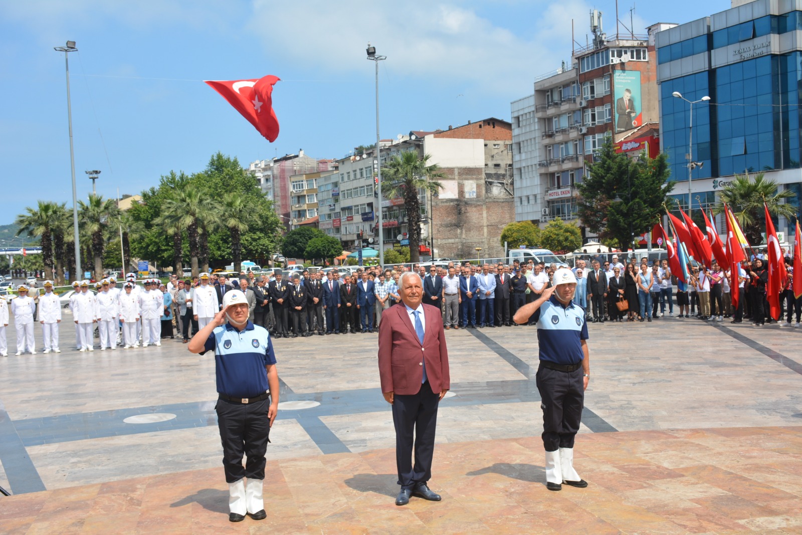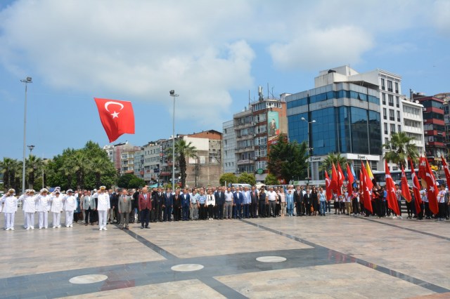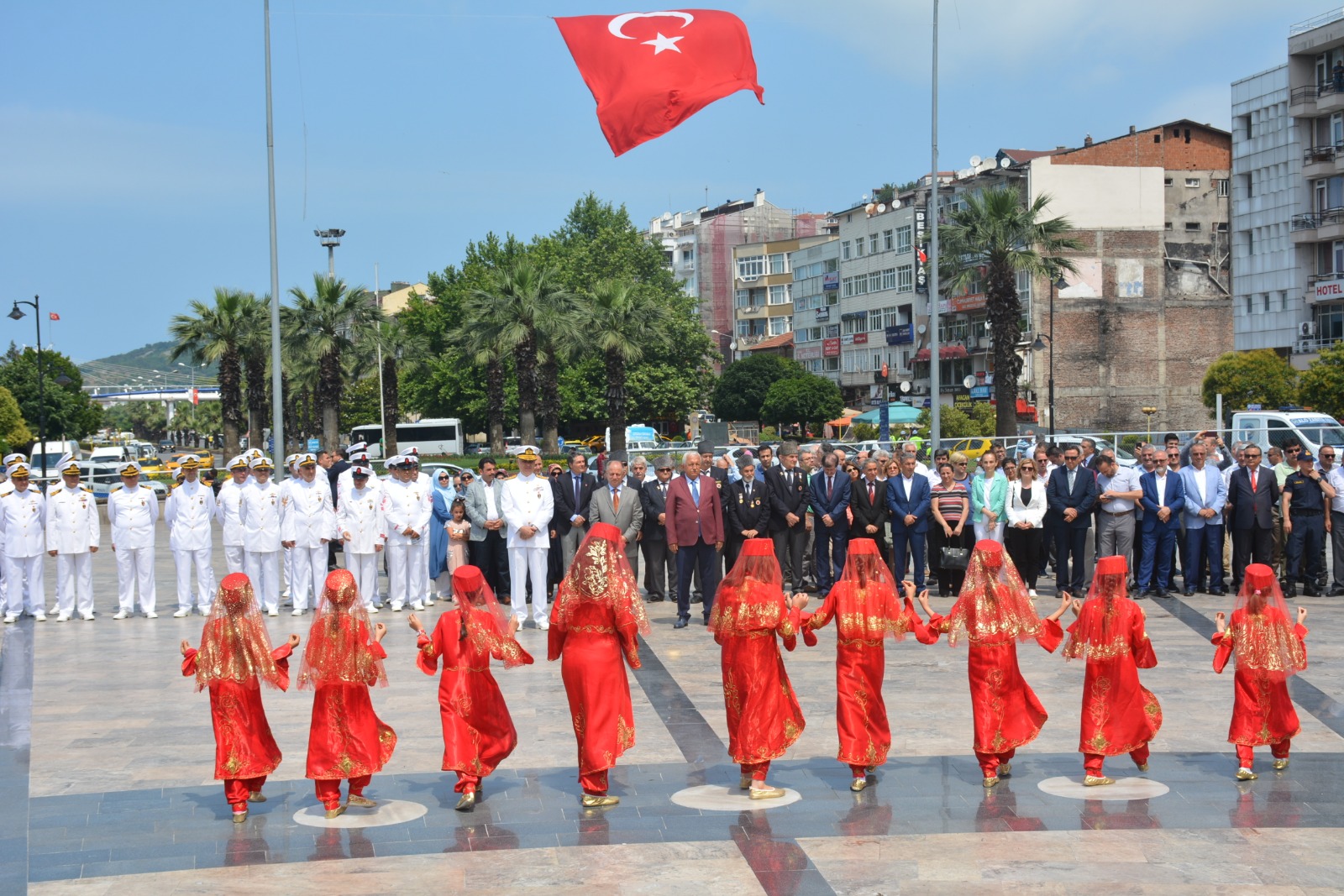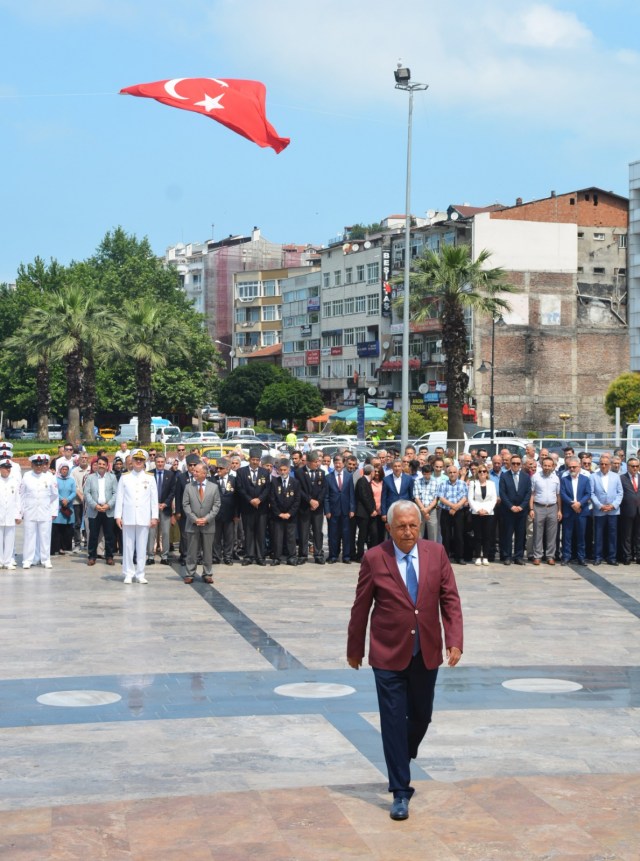 Atatürk Anıtı önünde düzenlenen törene Karadeniz Ereğli Kaymakamı İsmail Çorumluoğlu, Karadeniz Bölge ve Garnizon Komutanı Tuğamiral Cemal Özden Yazıcıoğlu, Ereğli Belediye Başkanı Halil Posbıyık, AK Parti İlçe Başkanı Mehmet Fatih Çakır, CHP İlçe Başkanı Sevdekar Aras, meslek örgütü ve sivil toplum kuruluşu temsilcileri, gaziler, askeri ve sivil erkan ile vatandaşlar katıldı.