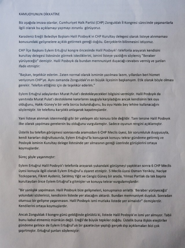 "Biz aşağıda imzası olanlar, Cumhuriyet Halk Partisi (CHP) Zonguldak İl Kongresi sürecinde yaşananlarla ilgili olarak bu açıklamayı yapmayı zorunlu görüyoruz.