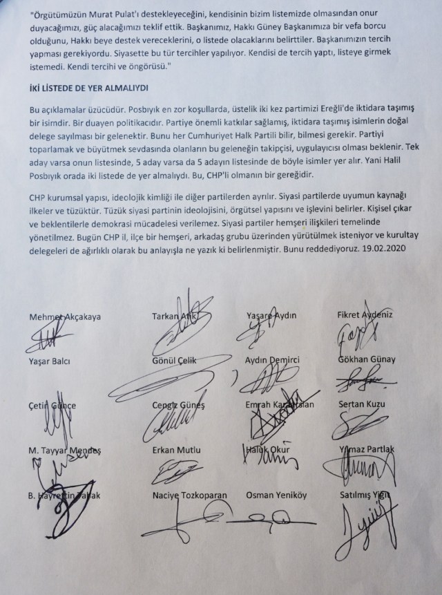 CHP Zonguldak İl Kongresi'nde, Kdz. Ereğli Belediye Başkanı Halil Posbıyık'ın isminin kurultay delegesi listesinde yer almaması ve ardından yapılan açıklamalar üzerine Ereğli CHP Meclis üyeleri ortak açıklama yayınladılar. 19 imzalı açıklamada "Posbıyık ismi iki listede de yer almalıydı. Bu, CHP geleneğidir. CHP il ve ilçe örgütü, hemşeri ilişkileriyle yürütülemez" denildi.